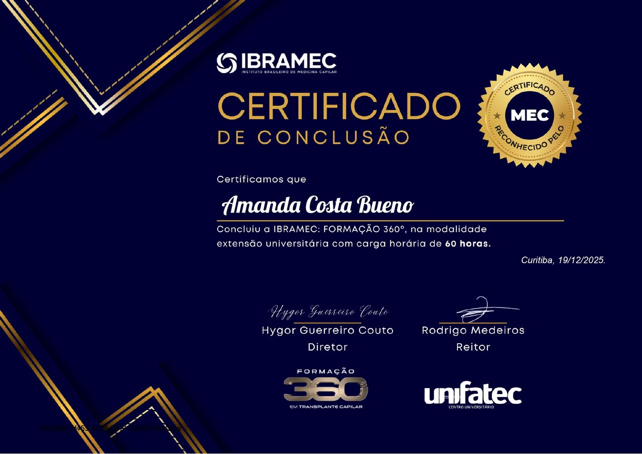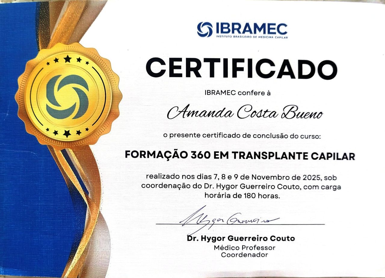 Sou Dra. Amanda Costa, médica pela UERN, tenho pós-graduação em Reumatologia pela UNINGA e diplomação em Transplante Capilar pelo Instituto Brasileiro de Medicina Capilar, curso ministrado pelo Dr Higor Guerreiro, referencia no Brasil, na area .